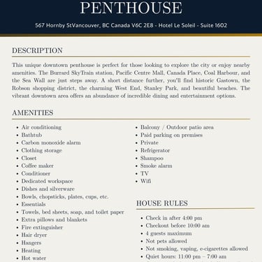 This unique downtown penthouse is amazing for anyone looking to explore the city or take advantage of the nearby amenities. The Burrard skytrain station, Pacific Centre Mall, Canada Place, Coal Harbour, and the Sea Wall are just steps away. Slightly further out you will find historic Gastown, the Robson shopping district, the charming West-End, Stanley Park and many beautiful beaches. There is also no limit to delicious food and drink that can be found in the many eateries downtown.